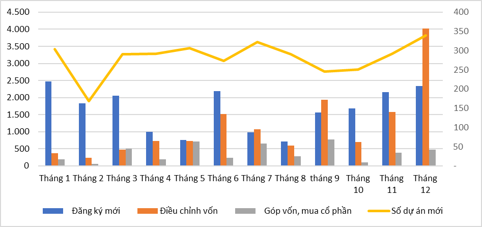 - Riêng tháng 12 năm 2024, ghi nhận tổng lượng vốn đầu tư lớn nhất so với các tháng trong năm với gần 6,85 tỷ USD, chiếm 17,9% tổng vốn đầu tư của cả nước trong năm 2024. Trong đó, vốn đầu tư tăng thêm, số lượng dự án đầu tư mới và số lượng giao dịch GVMCP cũng đạt mức cao nhất trong các tháng của năm 2024.