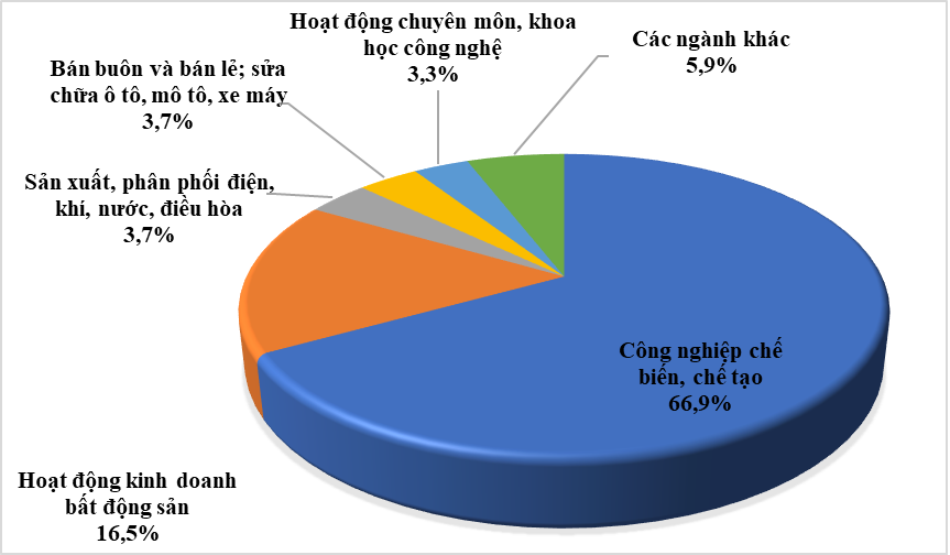 Các nhà đầu tư nước ngoài đã đầu tư vào 18 ngành trong tổng số 21 ngành kinh tế quốc dân. Trong đó, ngành công nghiệp chế biến, chế tạo dẫn đầu với tổng vốn đầu tư đạt gần 25,58 tỷ USD, chiếm 66,9% tổng vốn đầu tư đăng ký, tăng 1,1% so với năm 2023. Ngành kinh doanh bất động sản đứng thứ hai với tổng vốn đầu tư 6,31 tỷ USD, chiếm 16,5% tổng vốn đầu tư đăng ký, tăng 18,8% so với năm 2023. Tiếp theo lần lượt là các ngành sản xuất, phân phối điện và bán buôn bán lẻ với tổng vốn đăng ký đạt lần lượt hơn 1,42 tỷ USD và gần 1,41 tỷ USD; còn lại là các ngành khác như xây dựng, vận tải kho bãi, thông tin và truyền thông,…