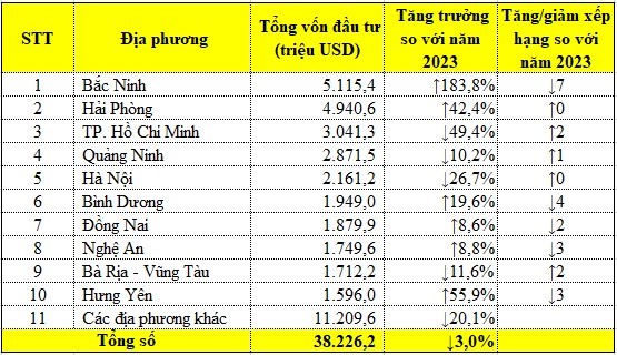 13,4% tổng vốn đầu tư cả nước, gấp hơn 2,8 lần cùng kỳ. Hải Phòng đứng thứ hai với hơn 4,94 tỷ USD, chiếm 12,9% tổng vốn đầu tư đăng ký, tăng 42,4% so với năm 2023. TP Hồ Chí Minh đứng thứ ba với tổng vốn đầu tư đăng ký hơn 3,04 tỷ USD, chiếm gần 8% tổng vốn đầu tư cả nước, giảm 49,4% so với năm 2023. Tiếp theo lần lượt là Quảng Ninh, Hà Nội, Bình Dương,…